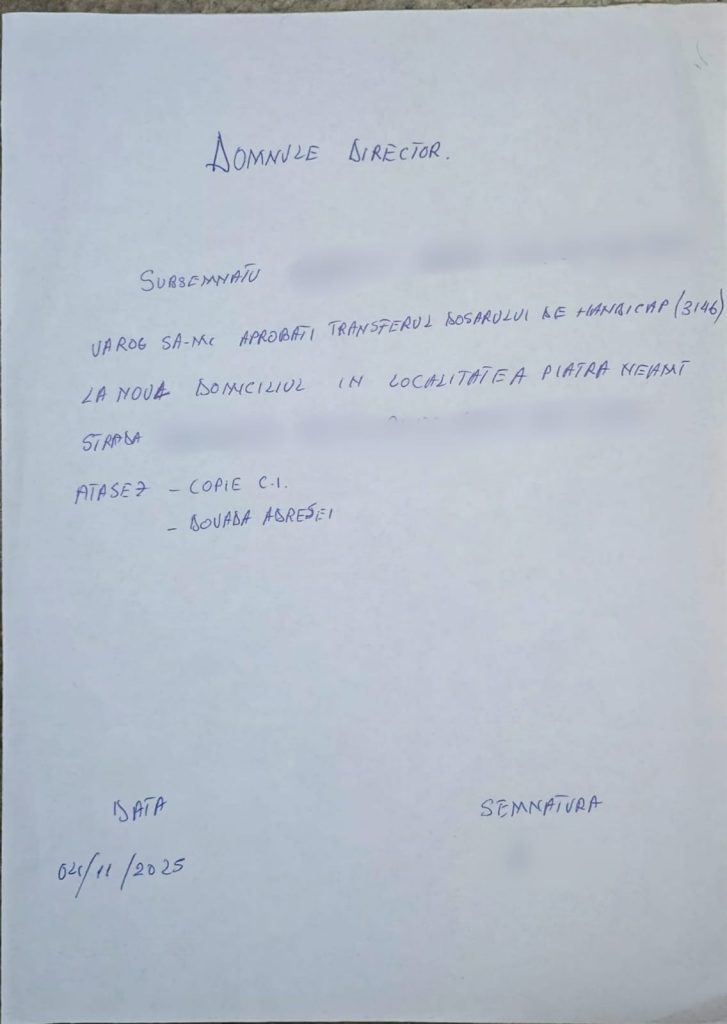 La redacția Roman TV a sunat un bărbat, vizibil afectat de chinul prin care ne-a mărturisit că trece de câteva luni. În vârstă de 45 de ani, acesta are certificat de încadrare în grad de handicap grav, cu asistent personal, permanent și nerevizuibil. Suferința sa a fost adâncită și mai mult de pierderea fiului său în vârstă de 22 de ani în toamna anului trecut, iar în urmă cu două săptămâni acesta susține că a suferit un AVC care l-a făcut și mai vulnerabil decât era deja. Bărbatul, căruia îi vom spune Andrei (pentru a-i păstra confidențială identitatea) – originar dintr-o comună situată lângă Municipiul Roman – s-a mutat în toamna anului trecut din Sectorul 5 al capitalei, la Piatra Neamț. La începutul lunii noiembrie 2025, Andrei a solicitat la Direcția Generală de Asistență Socială și Protecția Copilului (DGASPC) Sector 5 București transferul dosarului său de handicap în județul Neamț. Instituția din capitală a transmis solicitarea lui în județul nostru pe 26 noiembrie 2025.