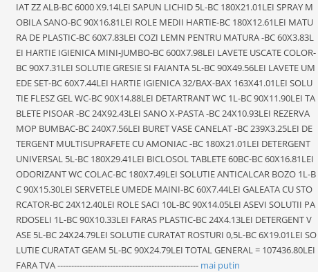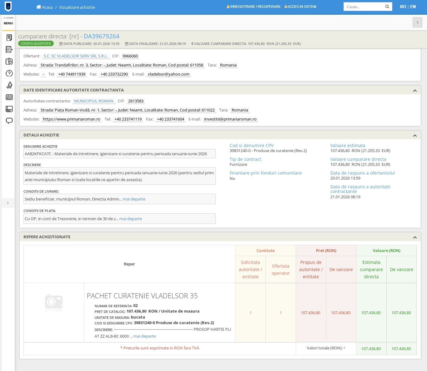 Mai exact, în data de 21 ianuarie 2026 Primăria Municipiului Roman a încheiat un contract cu SC. VLADELSOR SRL pentru achiziția de materiale de întreținere, igienizare și curățenie pentru perioada ianuarie-iunie 2026. Pachetul are o valoare de 107.436,80 lei fără TVA, deci de 21.205,33 euro fără TVA. Conform descrierii, pachetul conține – printre altele – 6.000 de bucăți de prosop de bucătărie, 180 de recipiente de săpun lichid a câte 5 L, 90 de spray-uri pentru curățat mobila, 60 de mături din plastic, 600 de bucăți de hârtie igienică mini Jumbo, 32 de baxuri de hârtie igienică, 240 de mopuri, 180 de recipiente de detergent multisuprafețe, 180 de recipiente detergent universal, cât și alte produse precum șervețele umede, găleată cu storcător, soluții anticalcar, detergent de vase ori soluție de curățat geamuri.