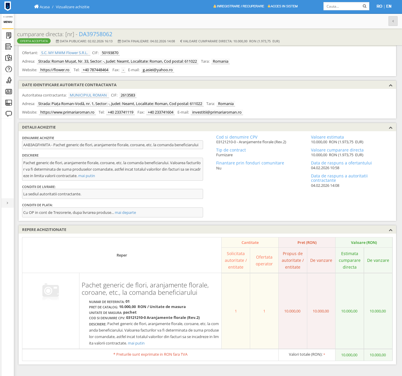 Pe 22 ianuarie 2026, Primăria Municipiului Roman a încheiat un contract cu SC. LA GRĂDINA STIL SRL, valoarea acestuia fiind de 53.700 de lei fără TVA, deci de 10.599,03 euro fără TVA. Pachetul generic conține flori, aranjamente florale, coroane și altele asemenea, la comanda beneficiarului. Tot pentru aranjamente florale, municipalitatea a încheiat pe 4 februarie 2026 un contract cu SC. MY MUM Flower SRL, în valoare de 10.000 de lei, deci de 1.973,75 euro fără TVA.