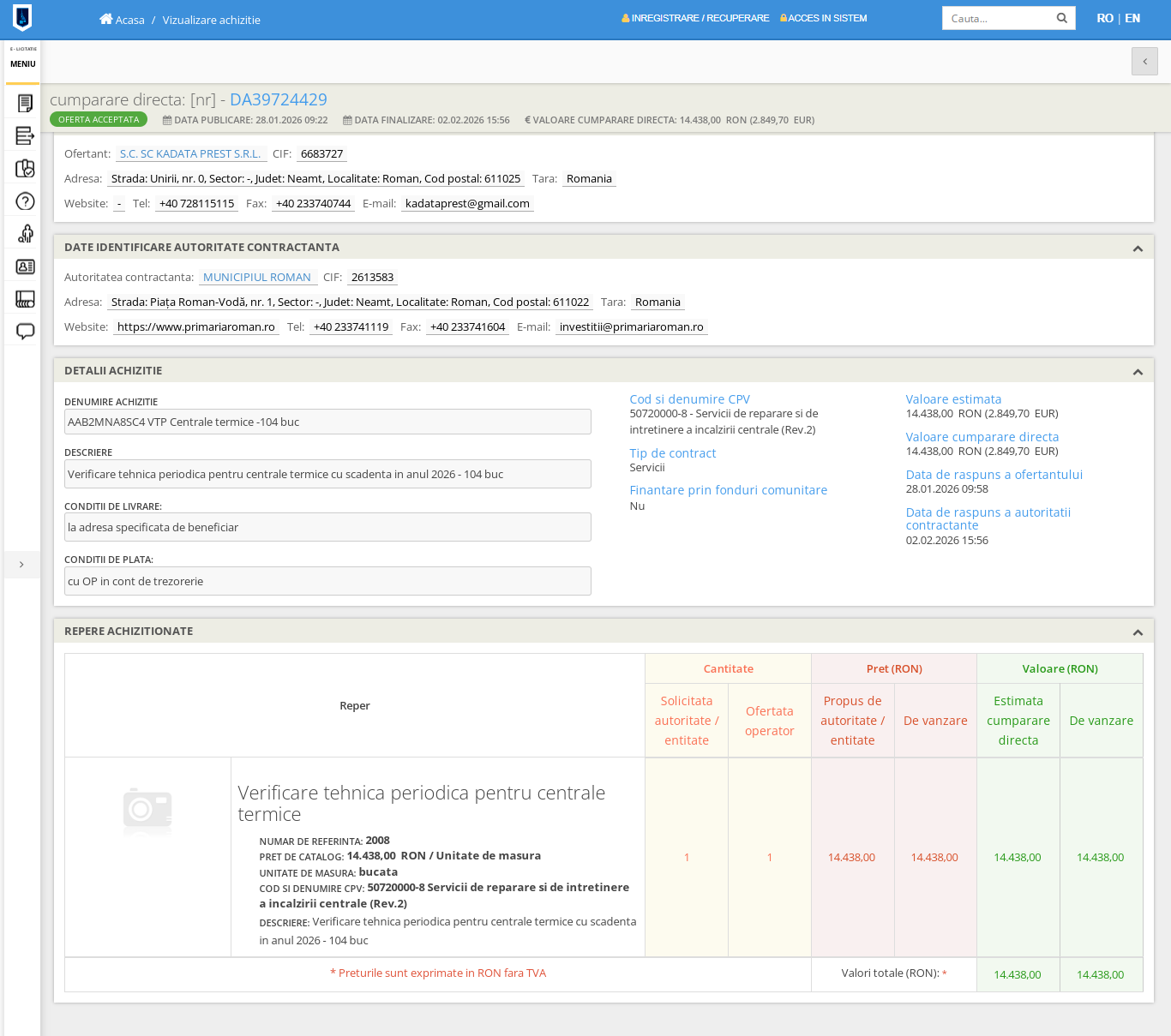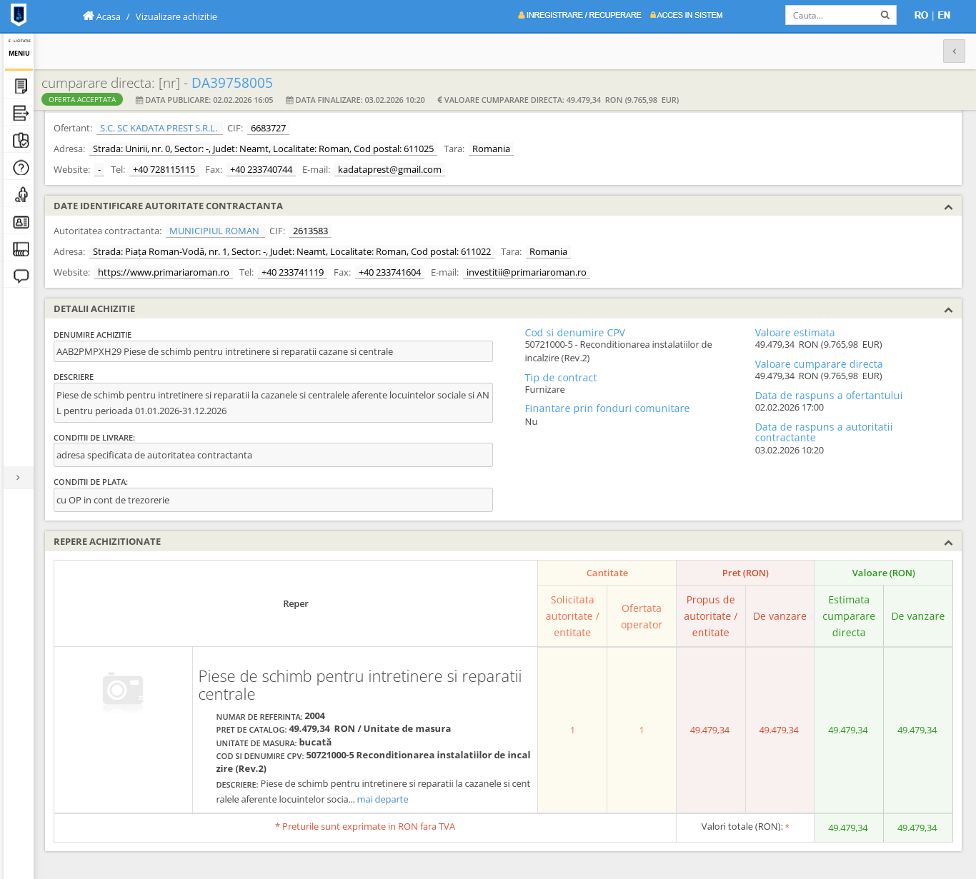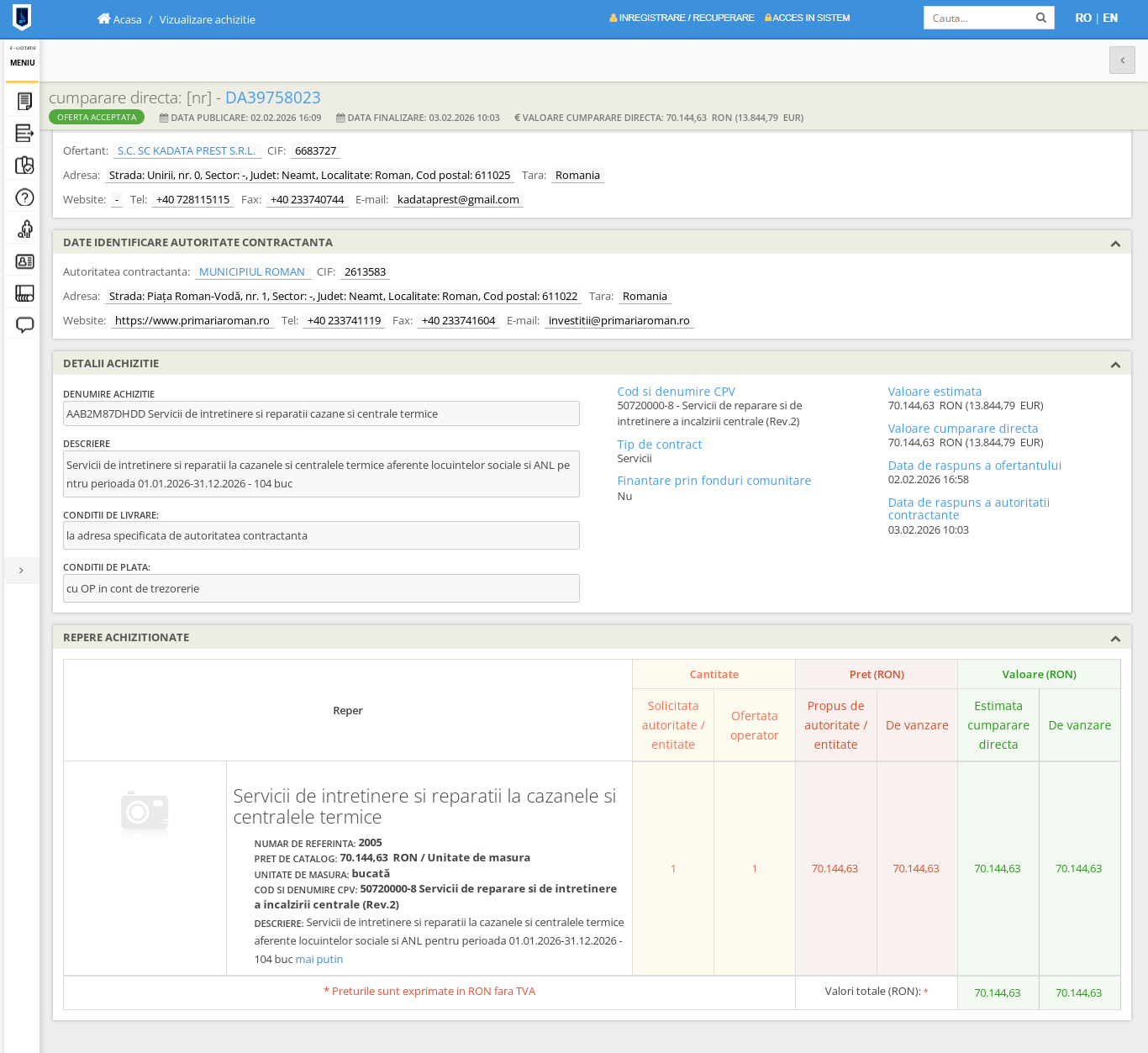 Pe 2, respectiv 3 februarie 2026, Municipiul Roman a încheiat trei contracte cu SC. KADATA PREST SRL pentru servicii de reparare și de întreținere a încălzirii centrale: unul pentru verificare periodică a 104 centrale termice în valoare de 14.438 lei fără TVA (2.849,70 euro fără TVA), al doilea pentru servicii de întreținere și reparații la cazanele și centralele locuințelor sociale și ANL în valoare de 70.144,63 lei fără TVA (13.844,79 euro fără TVA) și al treilea pentru piese de schimb și întreținere a cazanelor și centralelor termice ale locuințelor sociale și ANL în valoare de 49.479,34 lei fără TVA (9.765,98 euro fără TVA).