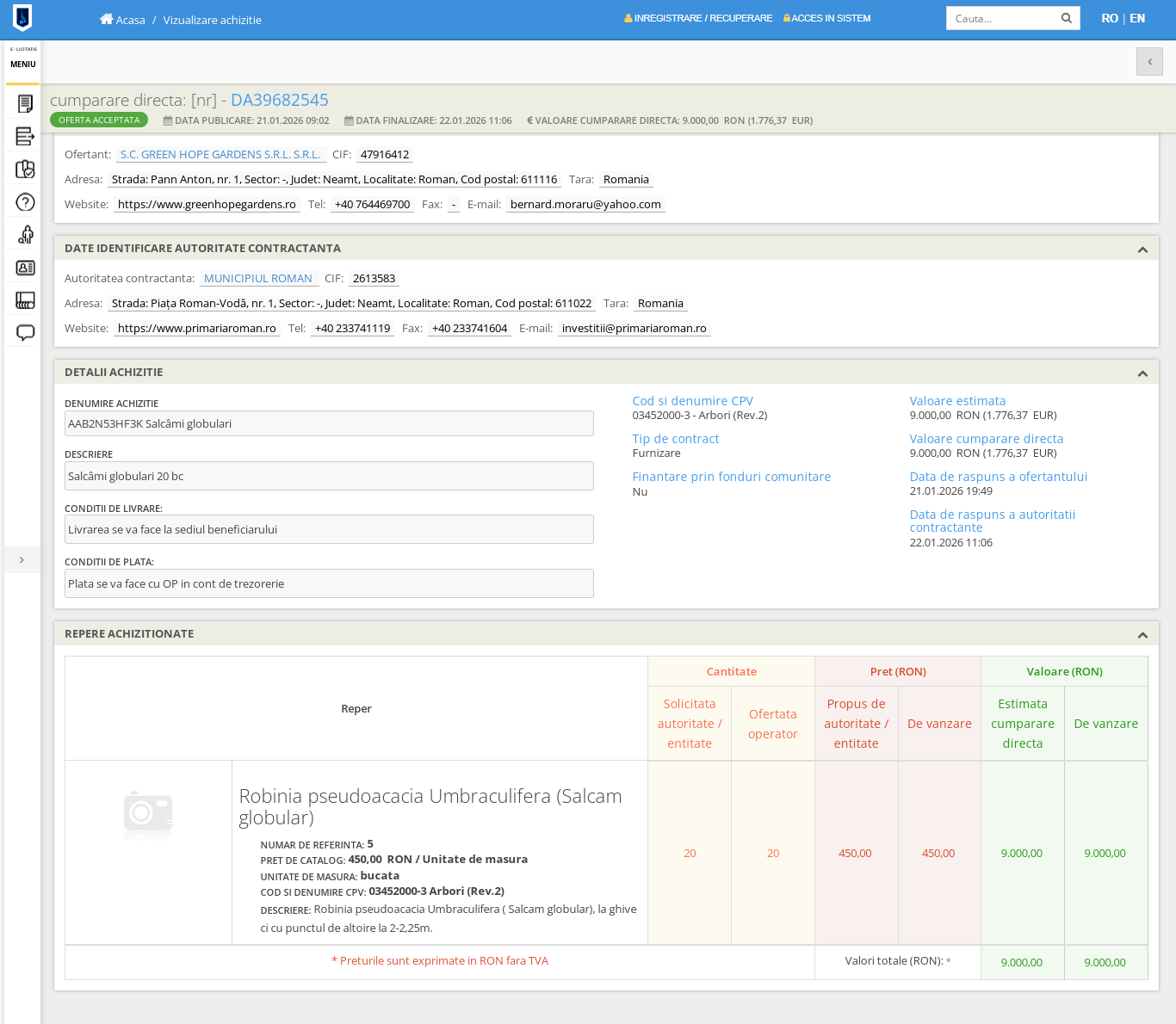 Pe 22 ianuarie 2026, municipalitatea a încheiat cu firma SC. GREEN HOPE GARDENS SRL un contract în valoare de 9.000 de lei, deci de 1.776.37 lei fără TVA, pentru achiziția a 20 de salcâmi globulari, la 450 de lei bucata.