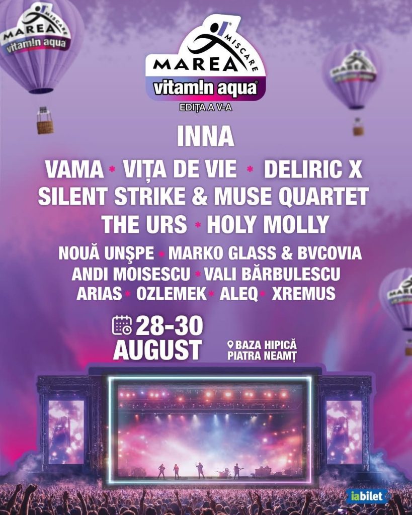 În perioada 28-30 august 2026, Baza Hipică „Col. Virgil Bărbuceanu” din Piatra Neamț va găzdui cea de-a V-a ediție a Festivalului „Marea Mișcare”. Trei zile legendare, cu invitați pe măsură și cu activități conexe care te scot din cotidian. Inna, Vama, Vița de vie, Deliric X, Silent Strike & Muse Quartet, The URS, Holy Molly, dar și Noua Unșpe, Marko Glass & BVCOVIA, Andi Moisescu, Vali Bărbulescu, Arias, Ozlemek, Aleq, XREMUS vă așteaptă la un show incendiar, așa cum v-a obișnuit festivalul fenomen care pune, cu succes, Județul Neamț pe harta evenimentelor de profil din țară.