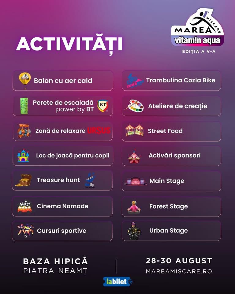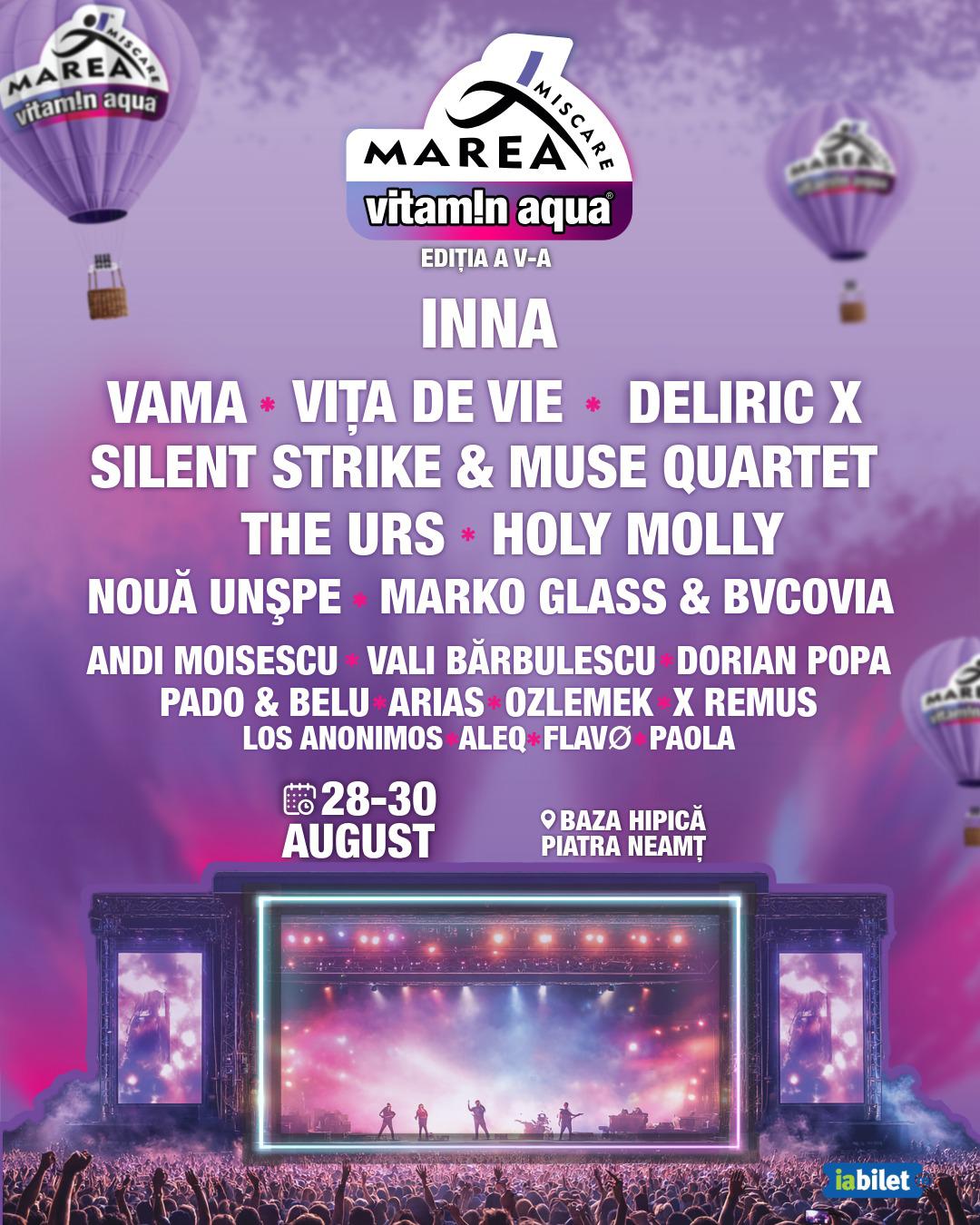 În perioada 28-30 august 2026, Baza Hipică „Col. Virgil Bărbuceanu” din Piatra Neamț va găzdui cea de-a V-a ediție a Festivalului „Marea Mișcare”. Trei zile legendare, cu invitați pe măsură și cu activități conexe care te scot din cotidian. Inna, Vama, Vița de vie, Deliric X, Silent Strike & Muse Quartet, The URS, Holy Molly, dar și Noua Unșpe, Marko Glass & BVCOVIA, Andi Moisescu, Vali Bărbulescu, Arias, Ozlemek, Aleq, XREMUS vă așteaptă la un show incendiar, așa cum v-a obișnuit festivalul fenomen care pune, cu succes, Județul Neamț pe harta evenimentelor de profil din țară.